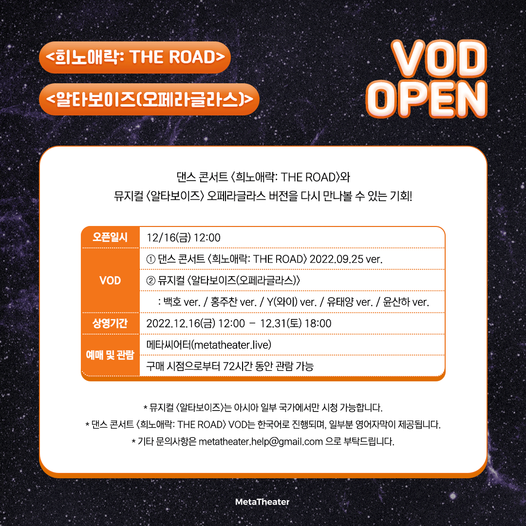 메타씨어터 VOD <희노애락: THE ROAD>, <알타보이즈(오페라글라스)> 오픈
